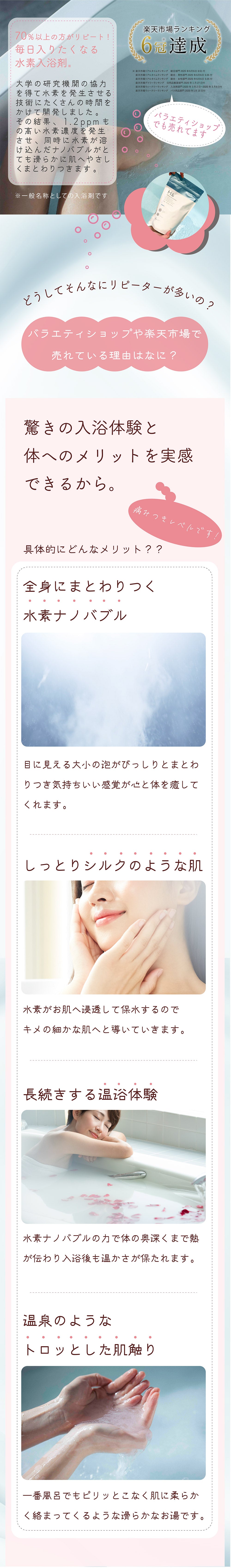 お湯に入った瞬間から細かい泡に包まれて、お肌がツルスベになります!とても気持ちよく長く入れます。子どもとの入浴でも安心です。ぐっすり眠れる気がします。