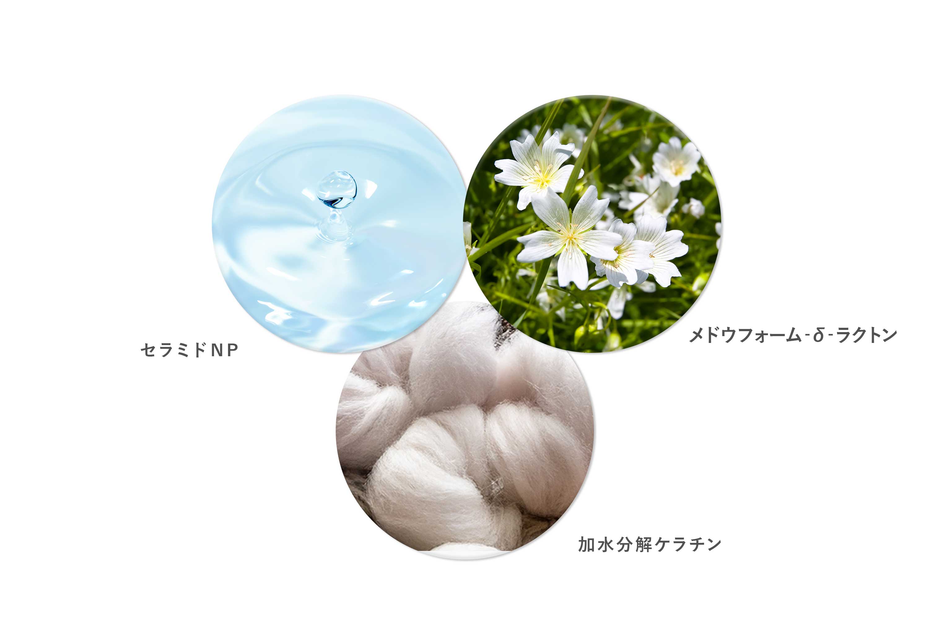 トリプル配合!セラミドNP、メドウフォーム-δ-ラクトン、加水分解ケラチンを配合。